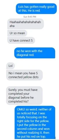 On my last chip – placed in column 2 — I had actually obtained five – not four — in a row, and by the layout of the board, it was clear I did so before Luis got four in a row. But I was oblivious. I was so focused on losing in column two, that I couldn’t see that I actually had won.